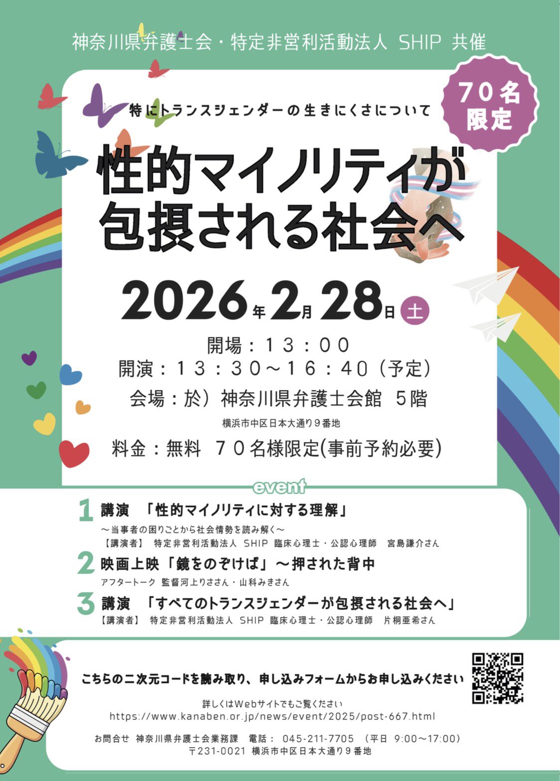 鏡をのぞけば~押された背中~2026.02.052026.02.28 神奈川にて鏡をのぞけば~押された背中~上映会&アフタートークあります! ポスト シェア はてブ 送る Pocket 「鏡をのぞけば 〜押された背中〜」が上映される事となりました。 神奈川弁護士会(@kanaben_info)・特定非営利活動法人SHIP(@SHIP_official)共催「性的マイノリティが包摂される社会へ」~特にトランスジェンダーの生きにくさについて~ ⭐️詳細・ご予約⭐️https://kanaben.or.jp/news/event/2025/post-667.html